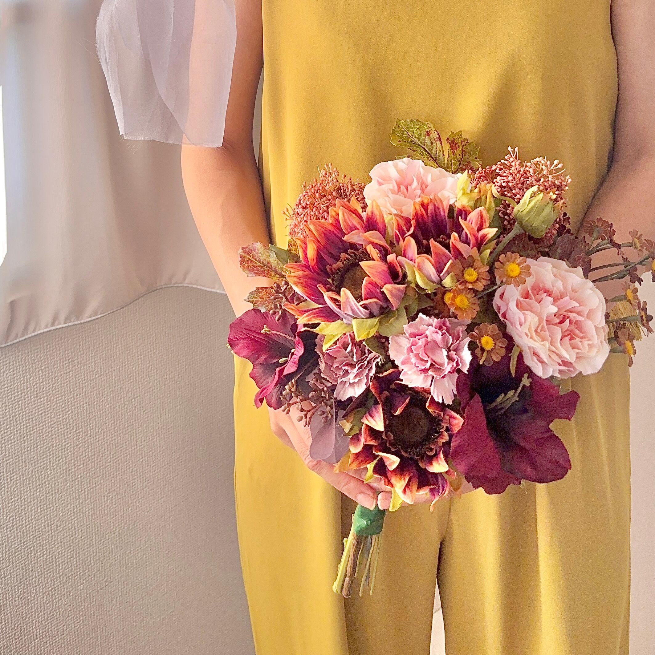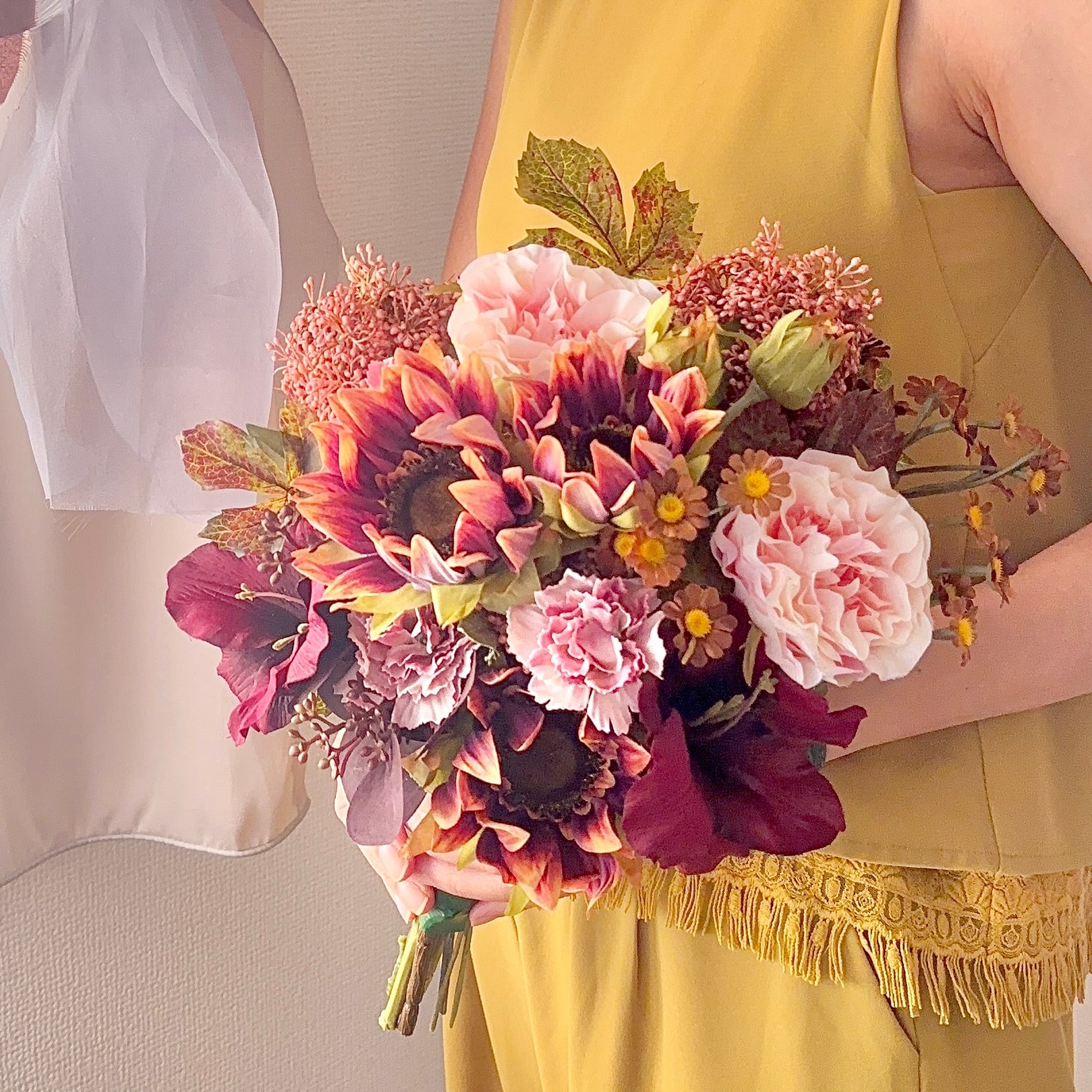 ひまわりブーケ♪レッド系やブラウン系のカラードレスにも合わせやすいデザインでお作りしました。