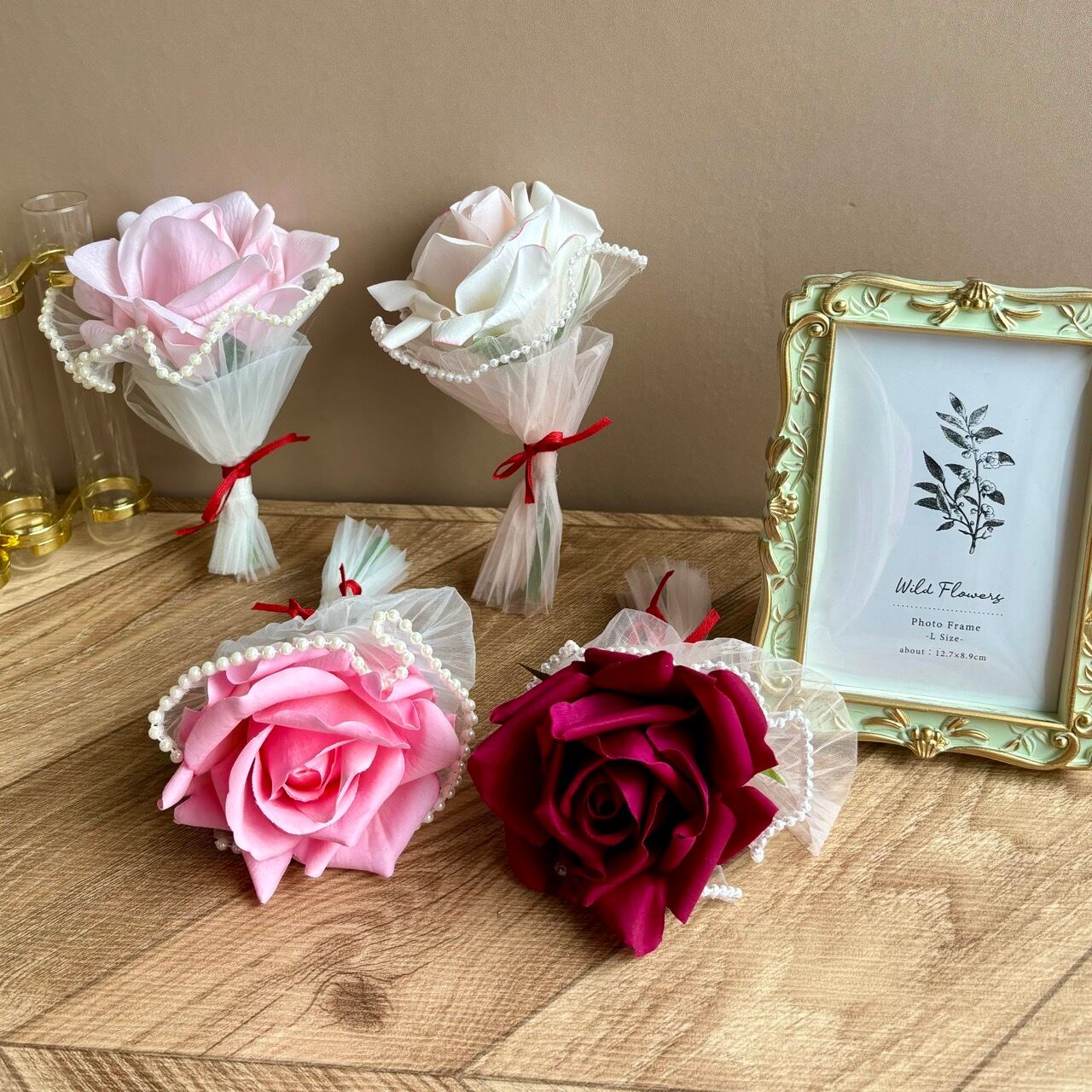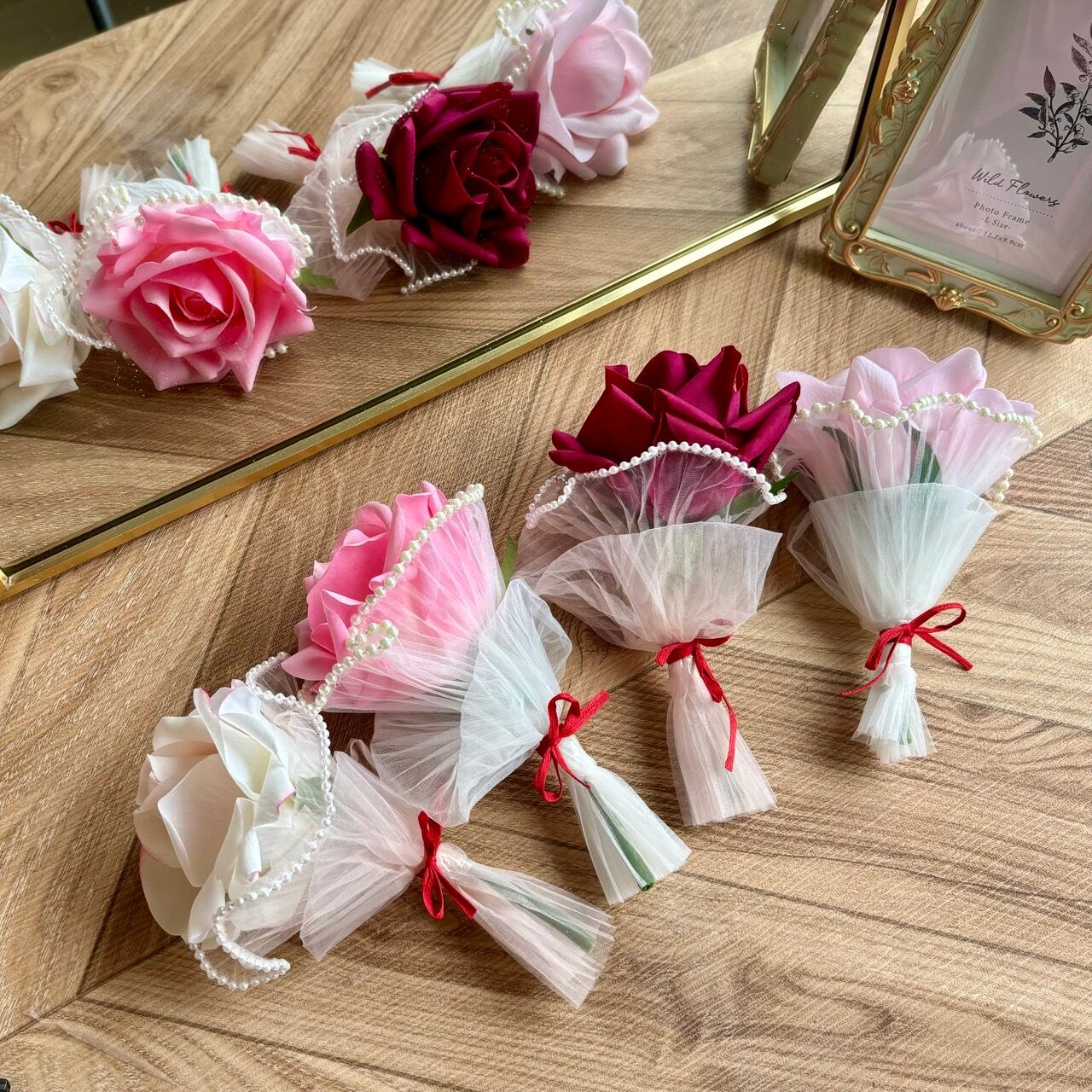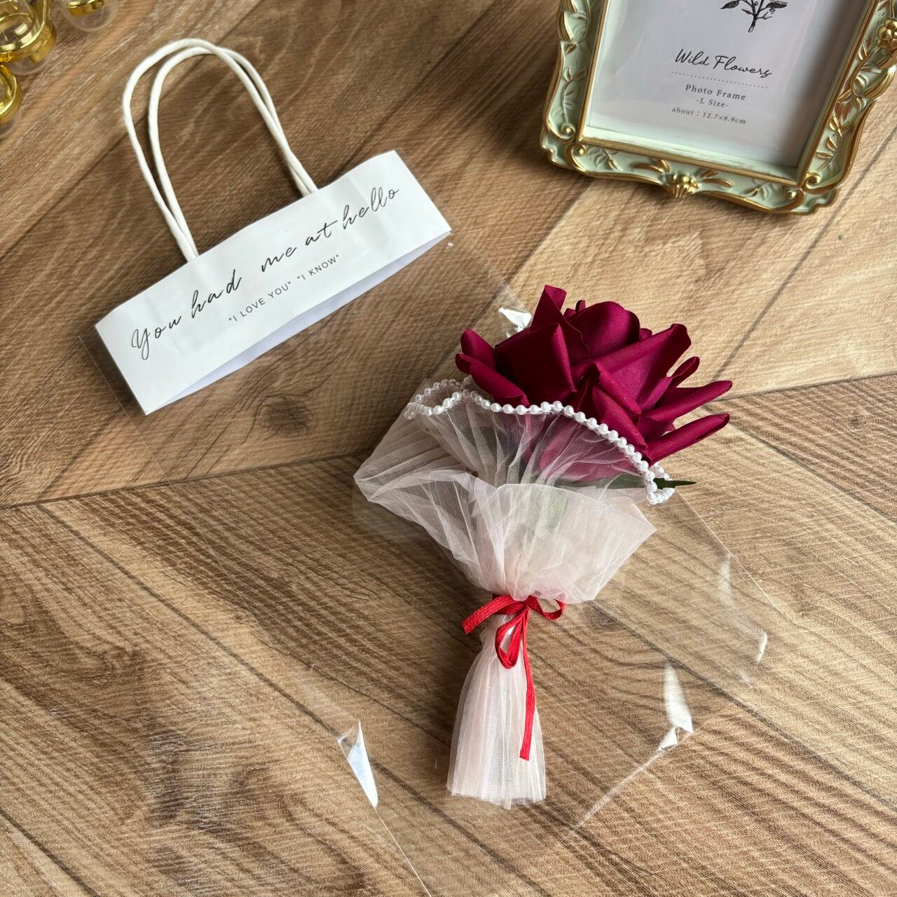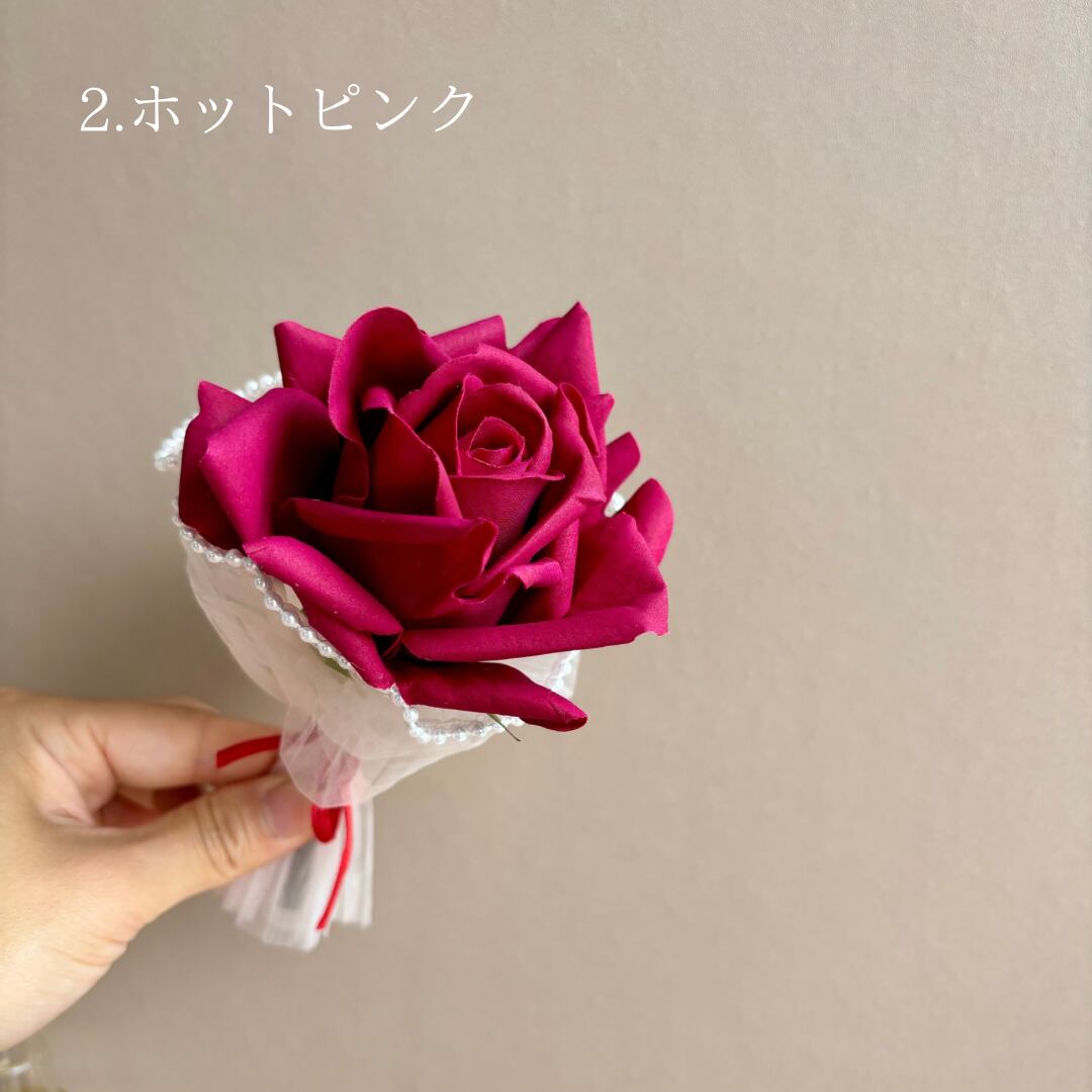 卒業シーズンに♪ 透明バッグ付 ユンヌローズ【Sweet】4色展開 ピンクバラ/白バラ パール チュールラッピング 韓国風花束 バラ1本 | FloweRimi 造花ウェディングブーケ/リーズナブルで可愛いブーケ