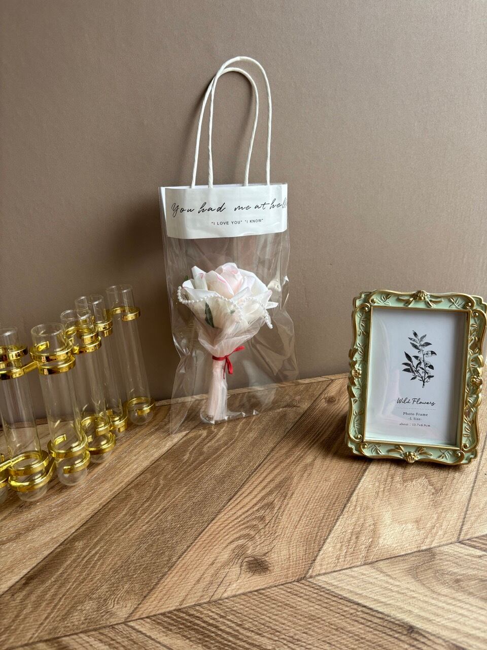 まるで生花のようた手触りのこだわりの造花のバラを透明バッグに入れて