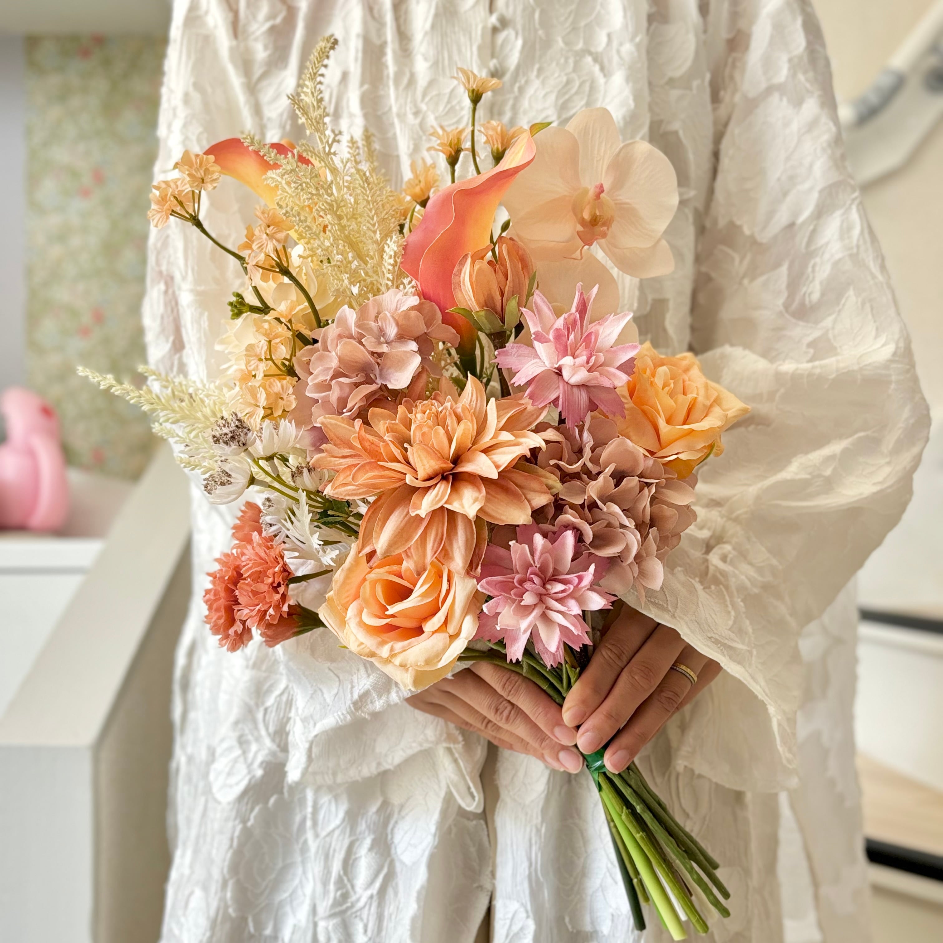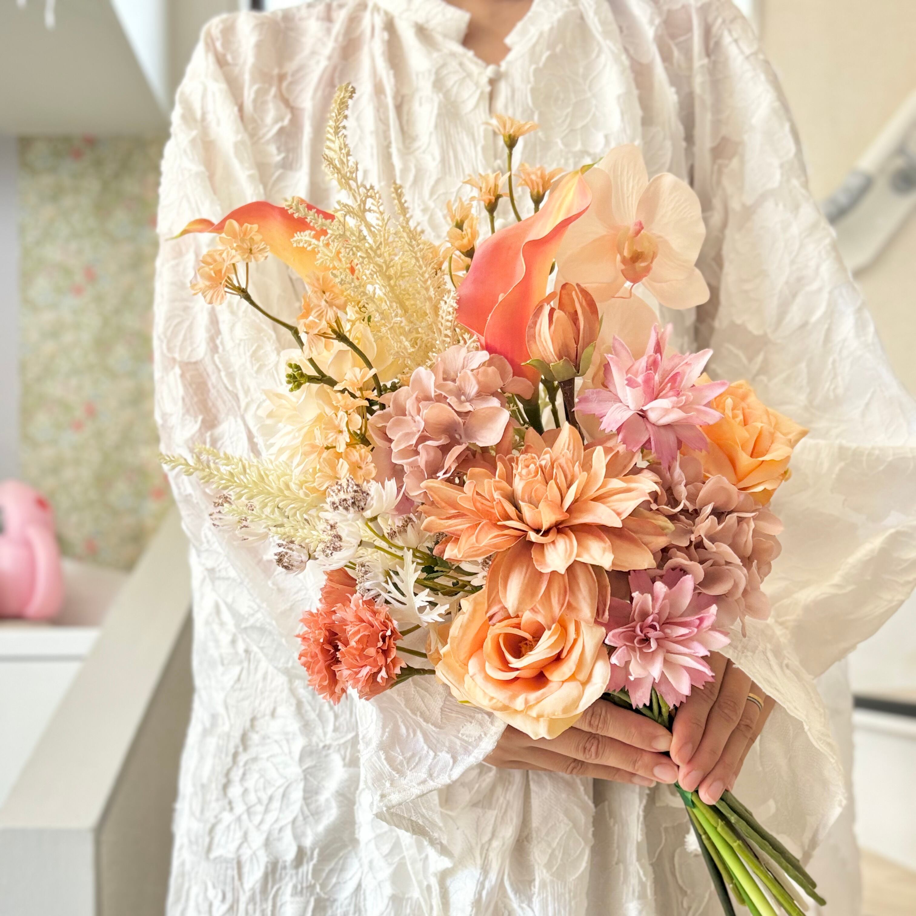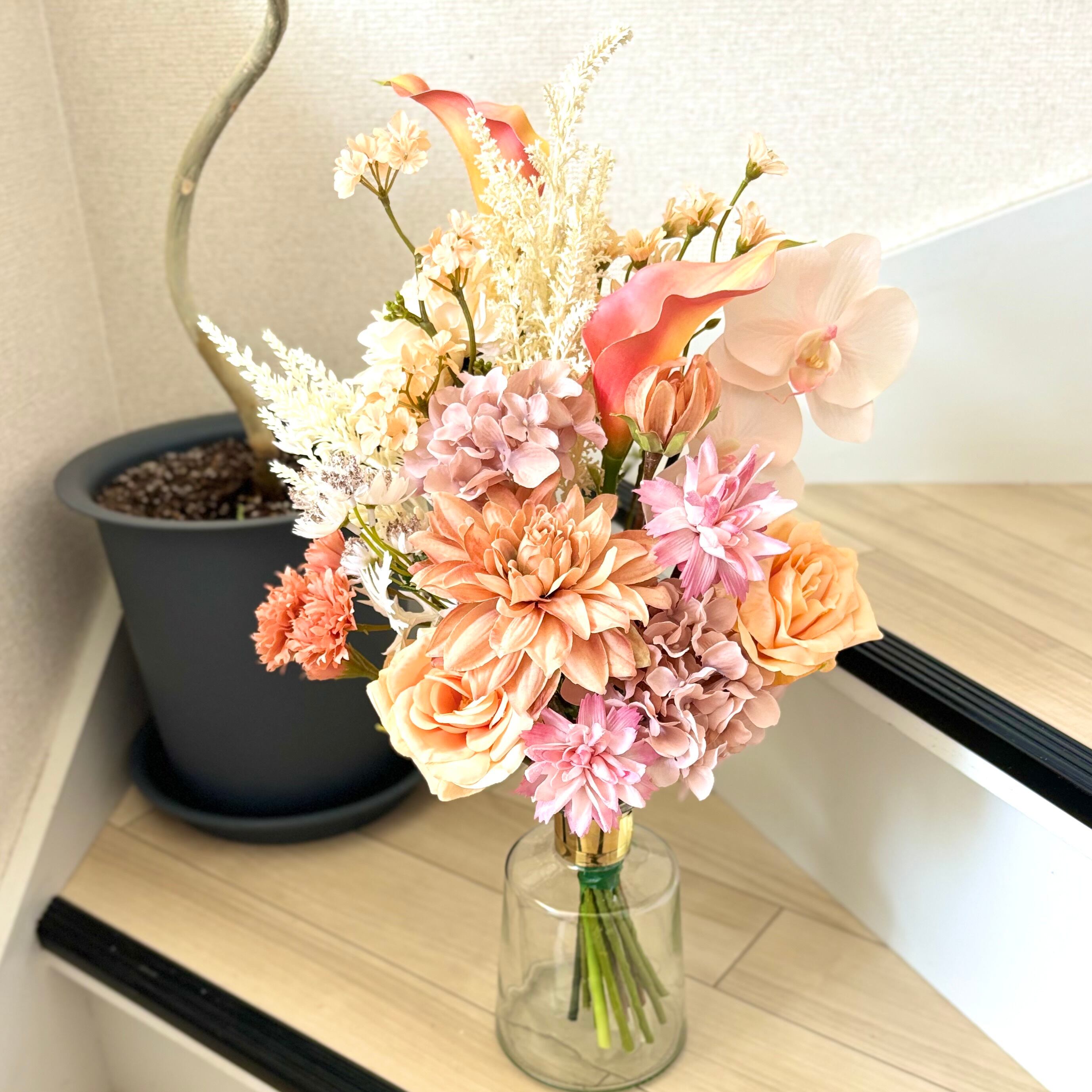 ピンクベージュ&オレンジのリゾートスタイル造花ブーケ リゾート ウェディング ブーケ カラー アーティフィシャルフラワー