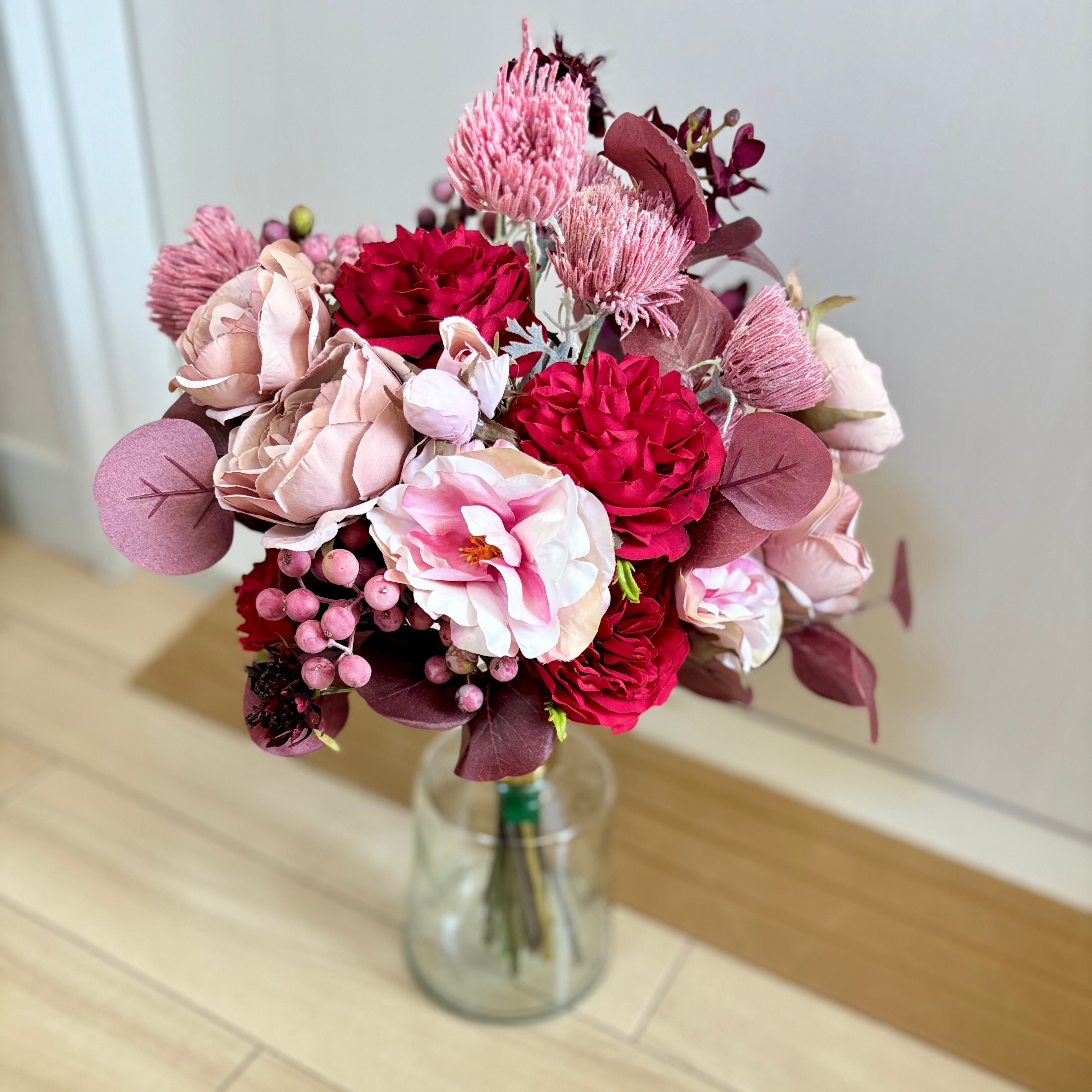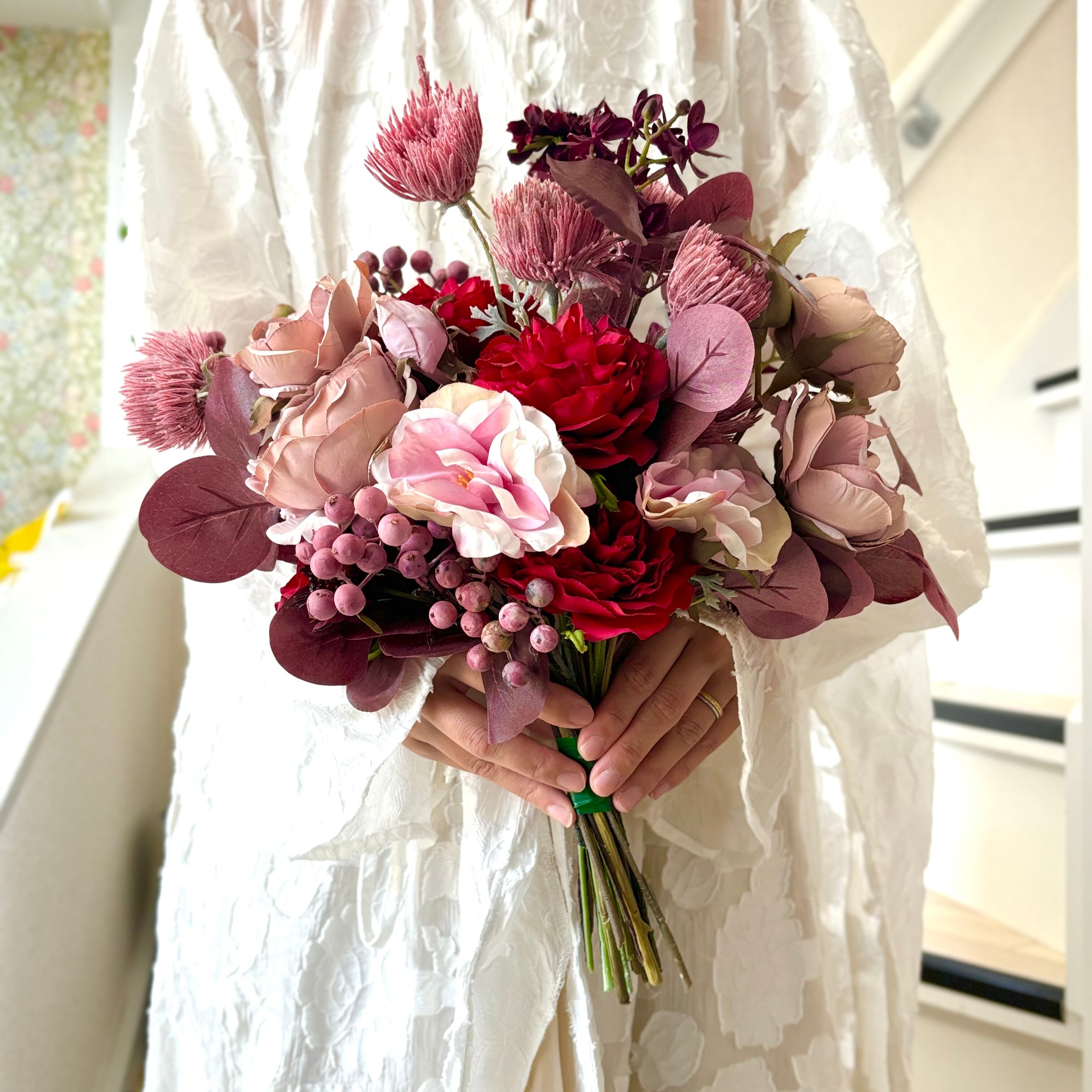 秋〜冬ウェディングにおすすめ♪レッド&ベージュカラーのデザインブーケ 造花 ブーケ ウェディング 前撮り